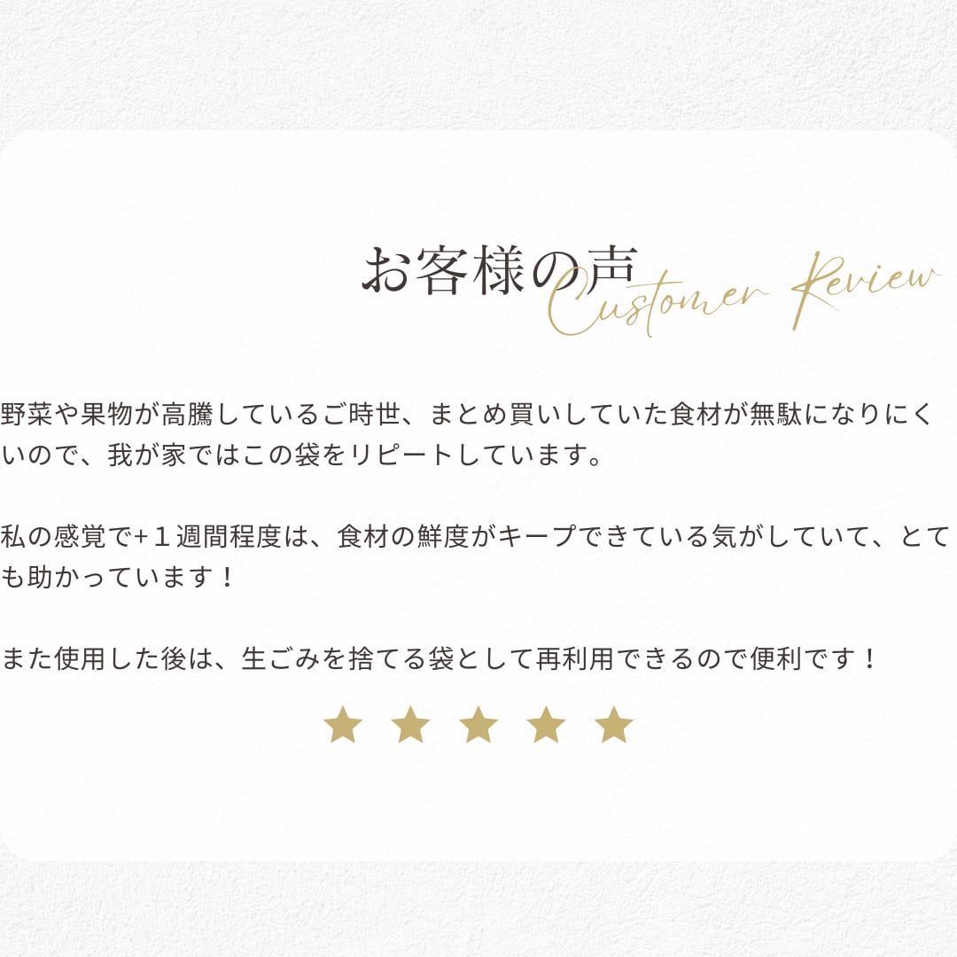 袋に添加された鮮度保持剤が野菜からでるエチレンガスを吸着し腐敗を遅らせ、また野菜から出る余分な水分を調整して適度な湿度を保ち、野菜などの鮮度保持効能を備えた袋です。